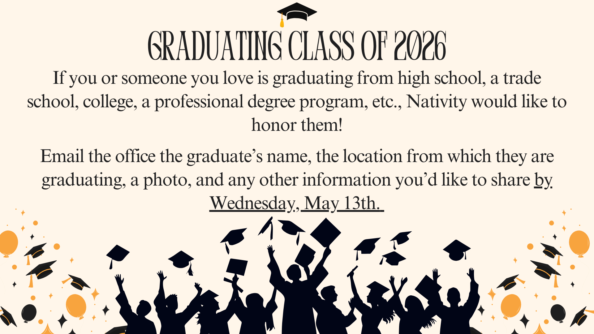 Congratulations Class of 2026! Graduation Sunday is coming up on May 17th. It’s a time where the Nativity Community likes to honor and bless those who have or will graduate this Spring. If you or a loved one would like to be included, please send an email to the office with the information below by Wednesday, May 13th.